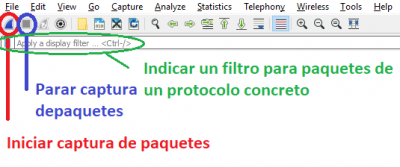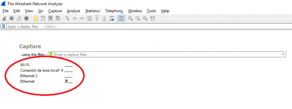 Una vez seleccionada la tarjeta, para empezar a capturar paquetes con Wireshark pulsaré el primer botón de la barra de herramientas: