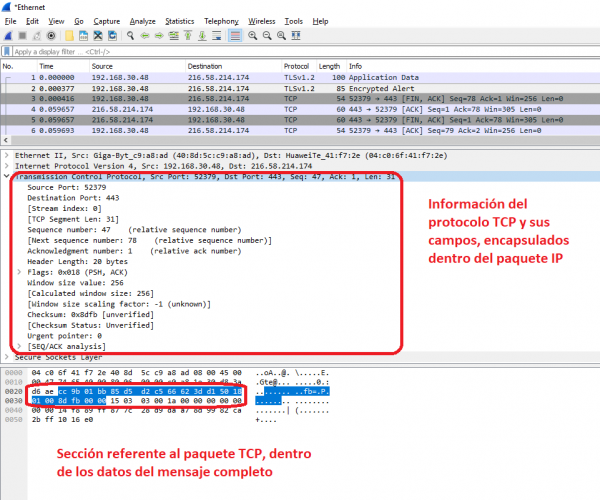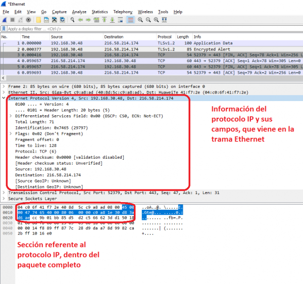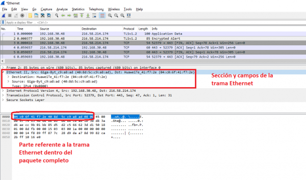 - Sección de protocolos: Se muestra la información que contiene el paquete seleccionado, organizada por las secciones de cada protocolo que hay dentro de es paquete. Aquí podemos ver toda la información de cada protocolo que está encapsulado en el paquete. Podemos desplegar la parte referente a cada protocolo.